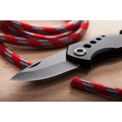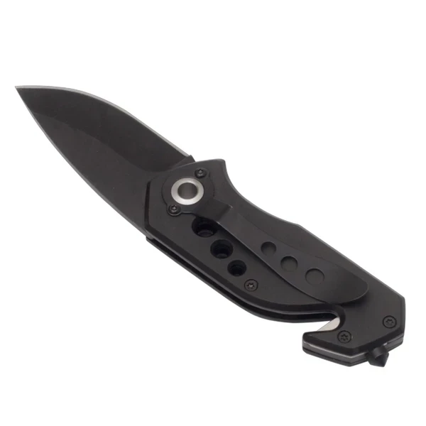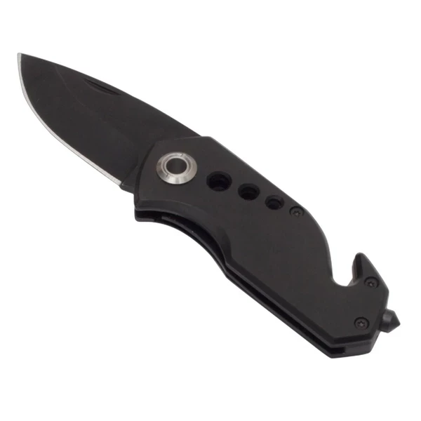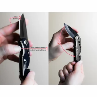 składany nóż z ostrzem o długości 58 mm, blokadą ostrza, młotkiem do rozbicia szyb, przecinakiem do samochodowych pasów bezpieczeństwa i klipem do zaczepienia. Zapakowany w czarnym poliestrowym etui.